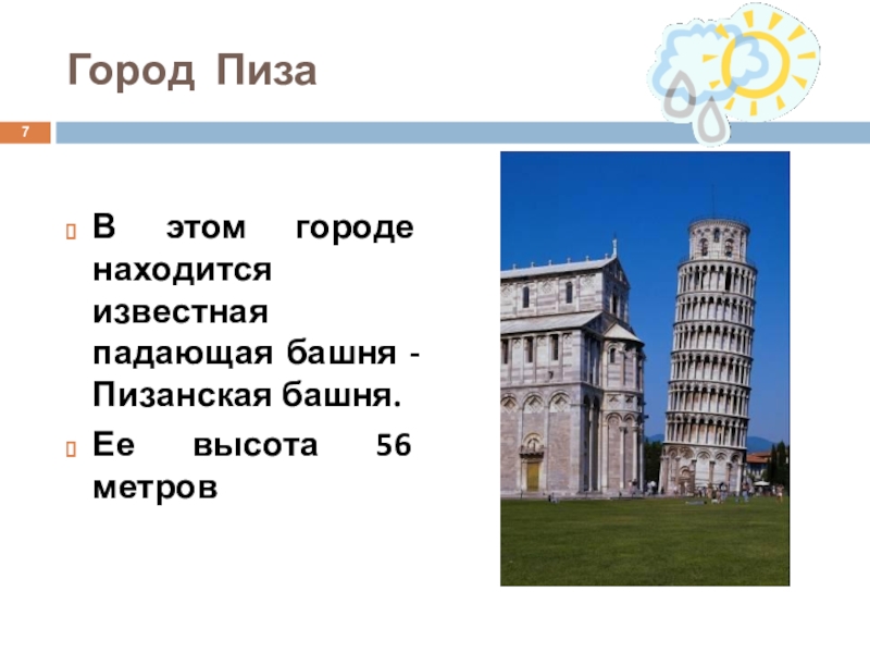 Город ПизаВ этом городе находится известная падающая башня -Пизанская башня. Ее высота 56 метров