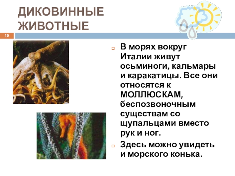 ДИКОВИННЫЕ ЖИВОТНЫЕВ морях вокруг Италии живут осьминоги, кальмары и каракатицы. Все они относятся к МОЛЛЮСКАМ, беспозвоночным существам