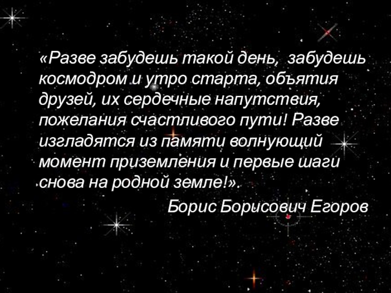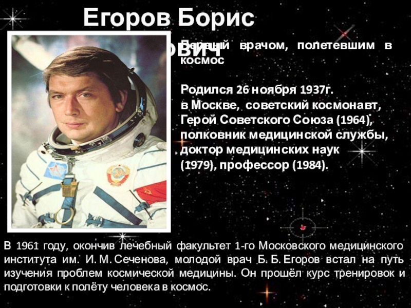 В 1961 году, окончив лечебный факультет 1-го Московского медицинского института им. И. М. Сеченова, молодой врач Б. Б. Егоров встал на путь изучения проблем космической медицины. Он прошёл курс тренировок и подготовки к полёту человека в космос.