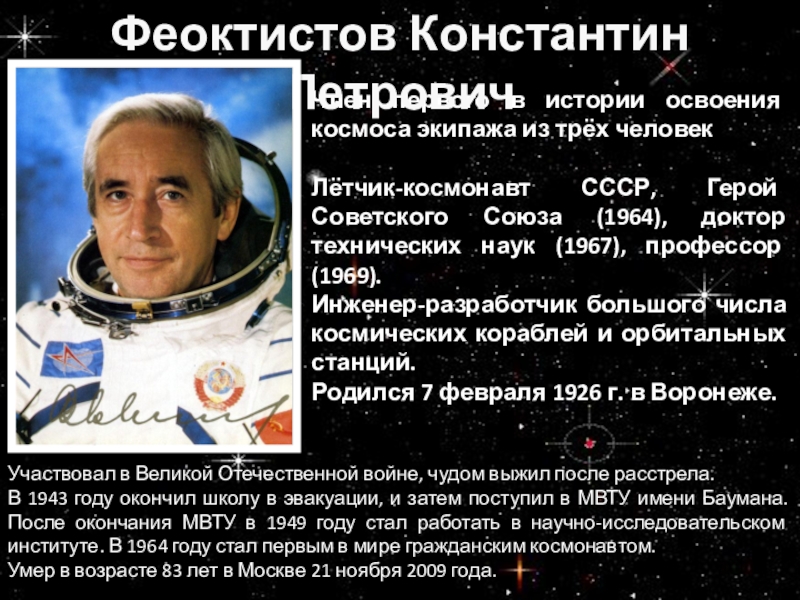 В 1943 году окончил школу в эвакуации, и затем поступил в МВТУ имени Баумана. После окончания МВТУ в 1949 году стал работать в научно-исследовательском институте. В 1964 году стал первым в мире гражданским космонавтом.
