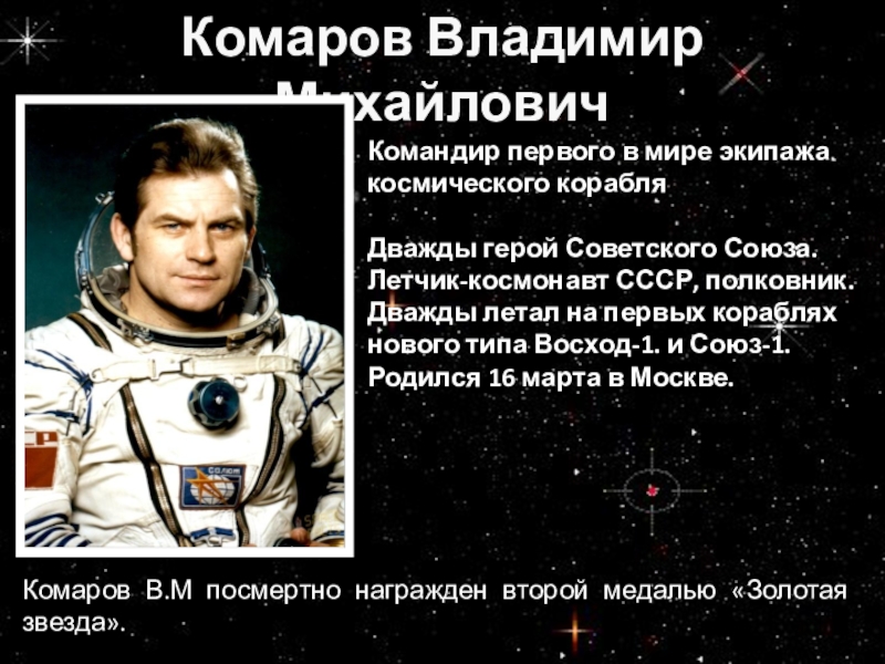 Комаров В.М посмертно награжден второй медалью «Золотая звезда».