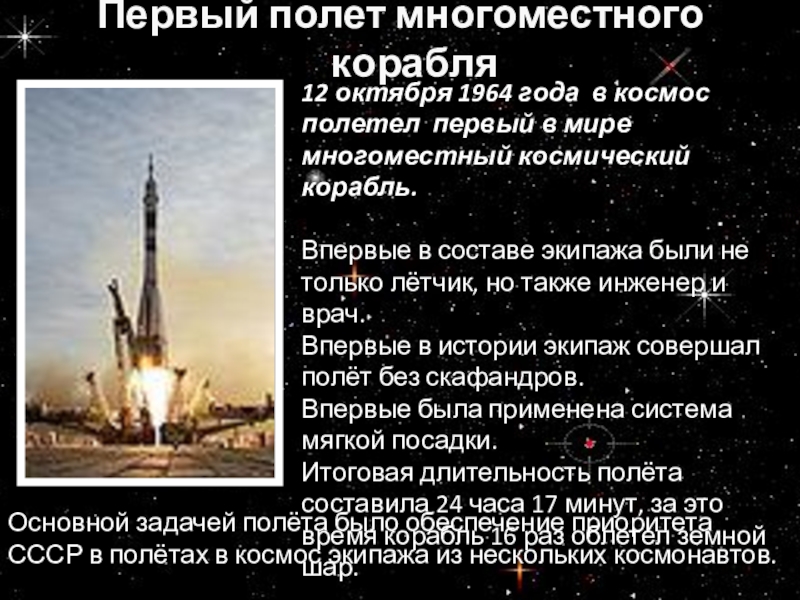 Основной задачей полёта было обеспечение приоритета СССР в полётах в космос экипажа из нескольких космонавтов.