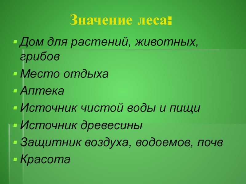 Значение леса:Дом для растений, животных, грибовМесто отдыхаАптекаИсточник чистой воды и пищиИсточник древесиныЗащитник воздуха, водоемов, почвКрасота