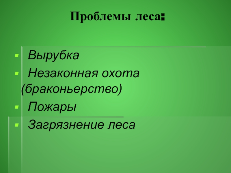 Проблемы леса: Вырубка Незаконная охота  (браконьерство) Пожары Загрязнение леса
