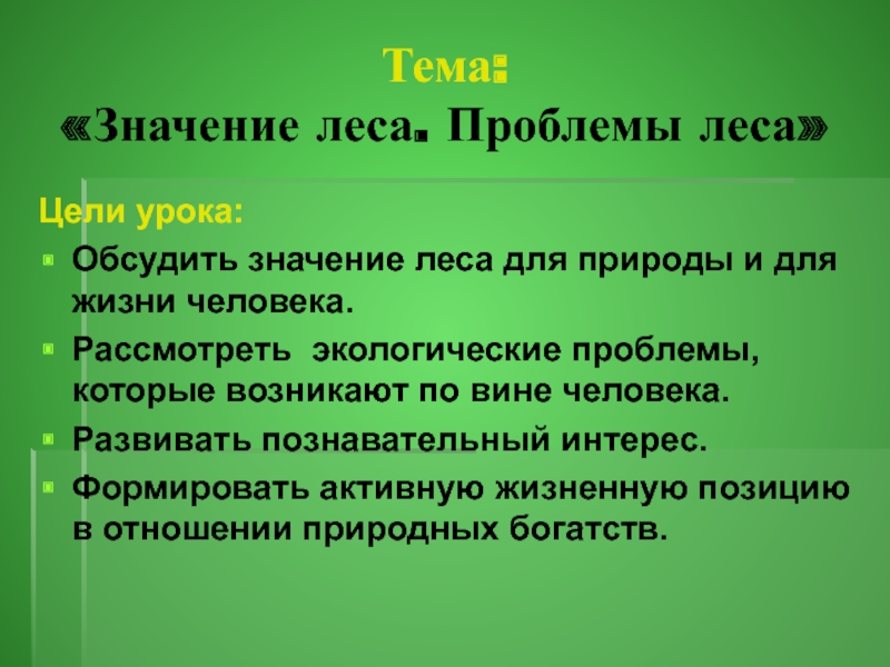 Тема:  «Значение леса. Проблемы леса»Цели урока:Обсудить значение леса для природы и для жизни человека.Рассмотреть экологические проблемы,