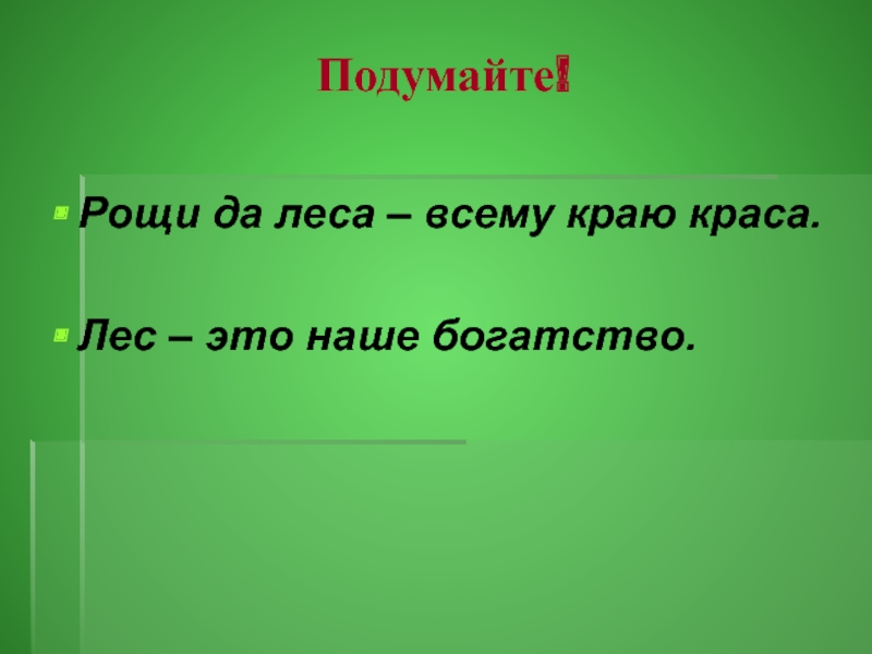 Подумайте!Рощи да леса – всему краю краса. Лес – это наше богатство.