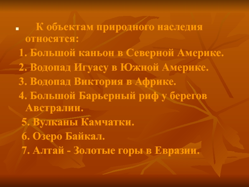 К объектам природного наследия относятся: 1. Большой каньон в Северной Америке. 2. Водопад Игуасу в Южной Америке. 3. Водопад