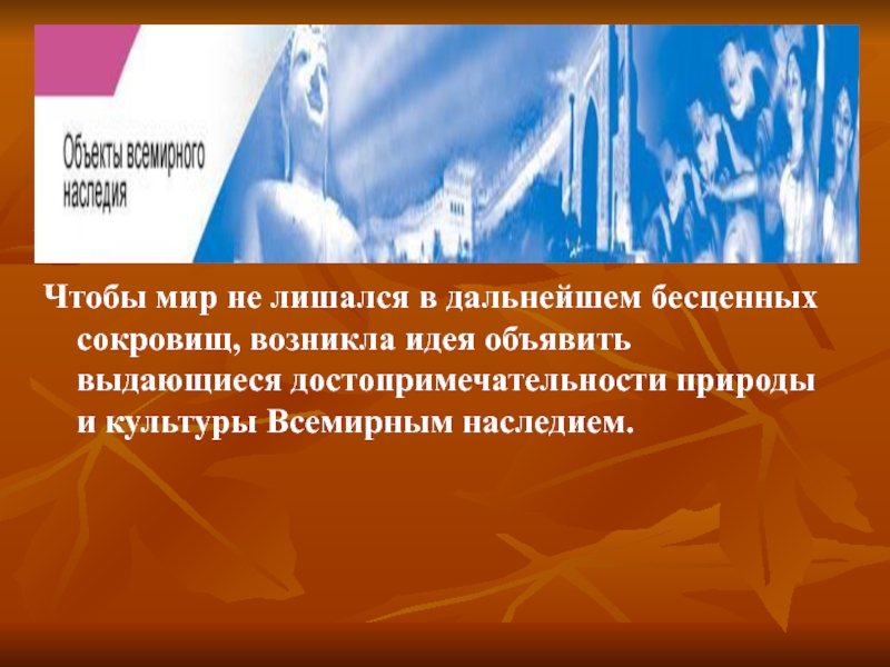 Слайд 12Чтобы мир не лишался в дальнейшем бесценных сокровищ, возникла идея объявить
