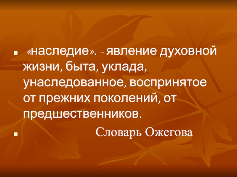 «наследие». - явление духовной жизни, быта, уклада, унаследованное, воспринятое от прежних поколений, от предшественников.