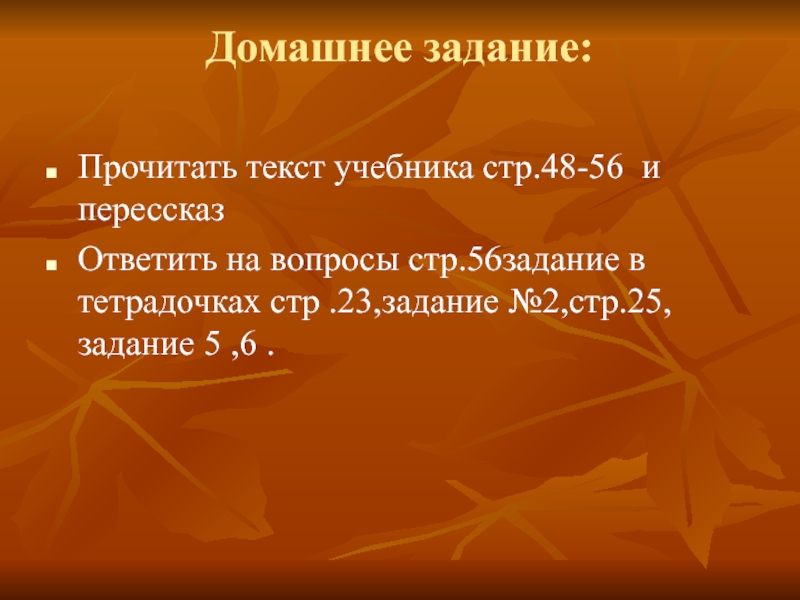 Домашнее задание: Прочитать текст учебника стр.48-56 и перессказ Ответить на вопросы стр.56задание в тетрадочках стр .23,задание №2,стр.25,задание