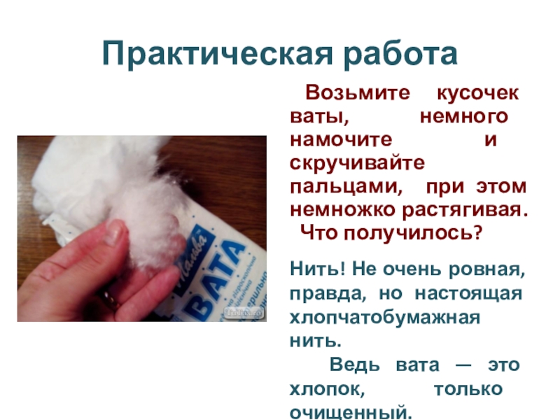 Возьмите кусочек ваты, немного намочите и скручивайте пальцами, при этом немножко растягивая.