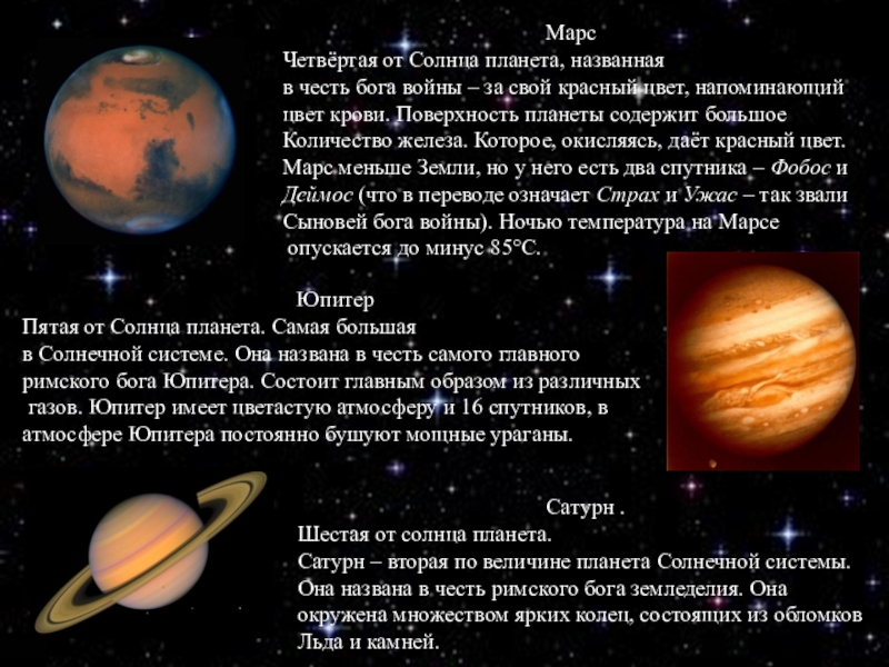 газов. Юпитер имеет цветастую атмосферу и 16 спутников, в