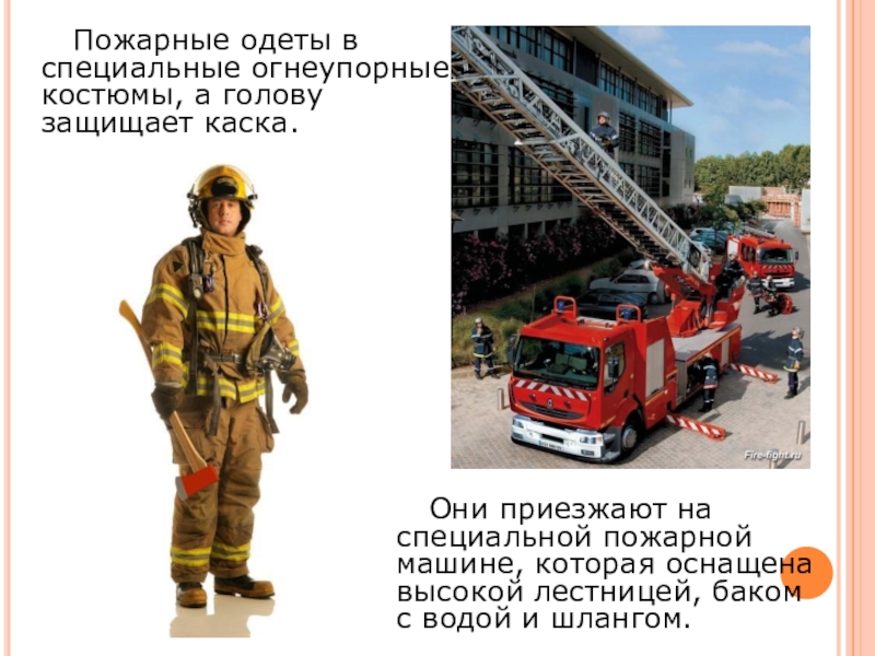 Они приезжают на специальной пожарной машине, которая оснащена высокой лестницей, баком с водой и шлангом.