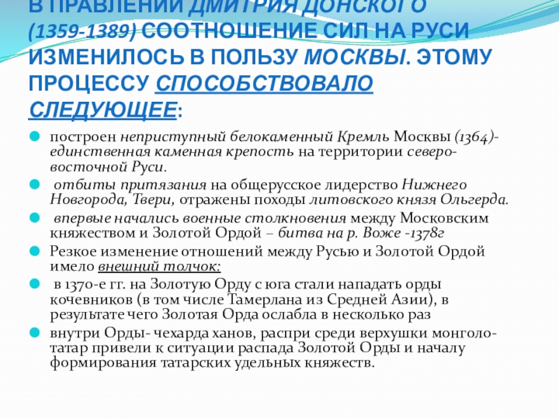 Слайд 7В правлении Дмитрия Донского (1359-1389) соотношение сил на Руси изменилось в