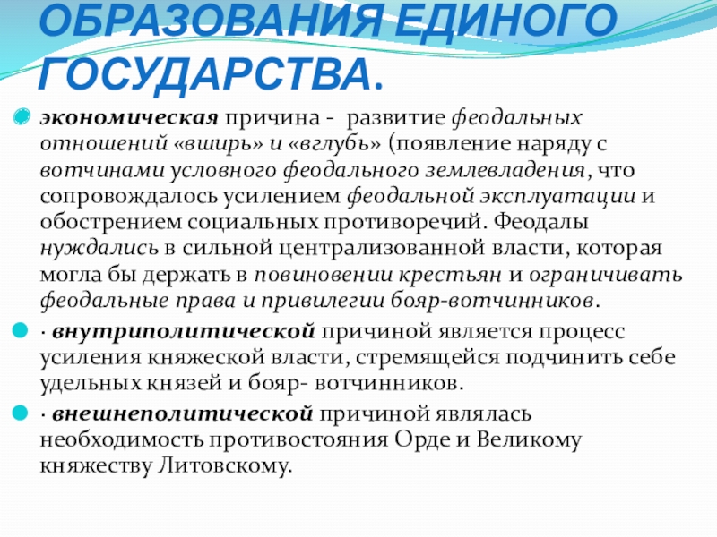 · внутриполитической причиной является процесс усиления княжеской власти, стремящейся подчинить себе удельных князей и бояр- вотчинников.