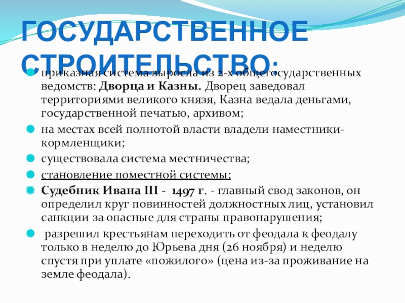 Судебник Ивана III - 1497 г. - главный свод законов, он определил круг повинностей должностных лиц, установил санкции за опасные для страны правонарушения;
