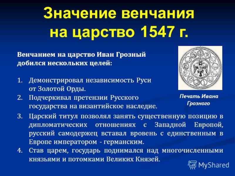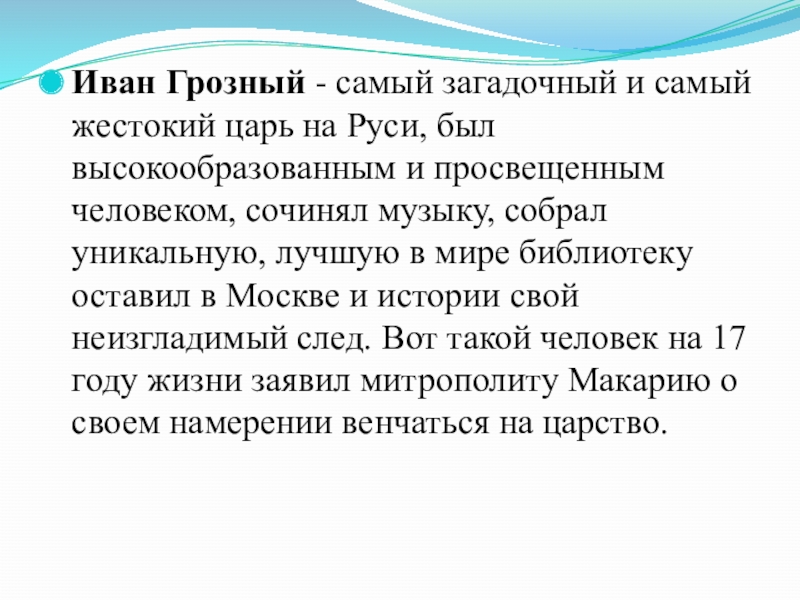 был высокообразованным и просвещенным человеком, сочинял музыку, собрал уникальную, лучшую в мире библиотеку оставил в Москве и истории свой неизгладимый след. Вот такой человек на 17 году жизни заявил митрополиту Макарию о своем намерении венчаться на царство.