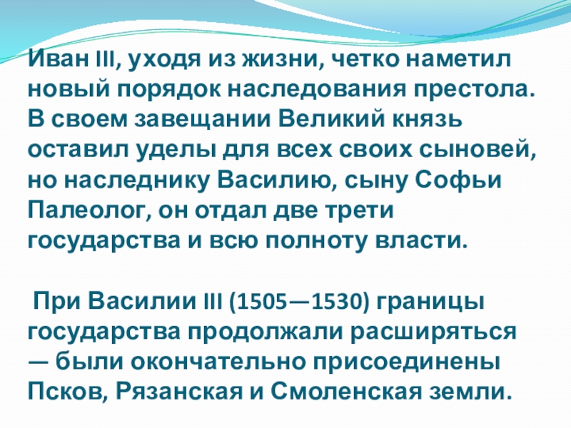Слайд 17Иван III, уходя из жизни, четко наметил новый порядок наследования престола.