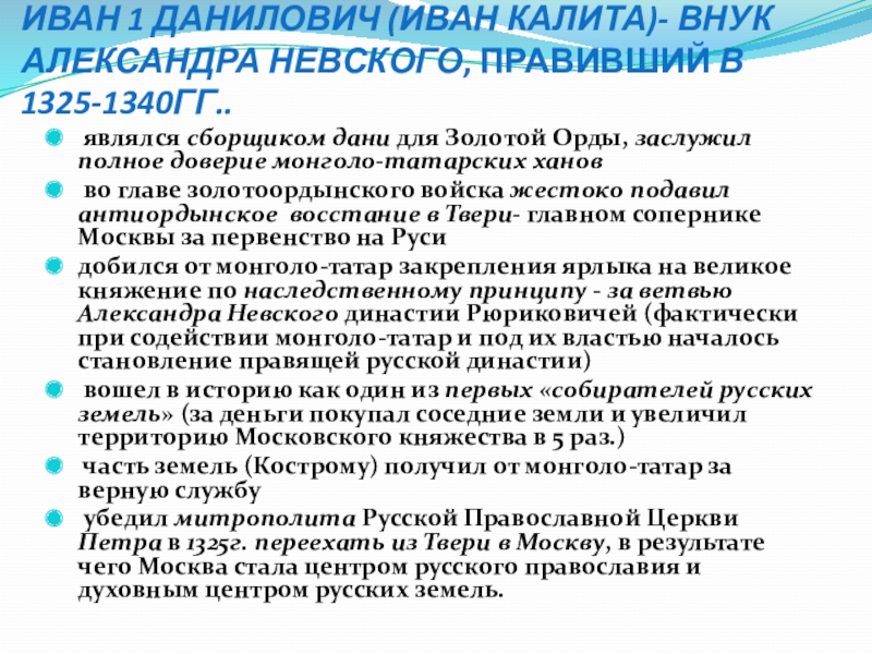 Слайд 6Иван 1 Данилович (Иван Калита)- внук Александра Невского, правивший в 1325-1340гг..