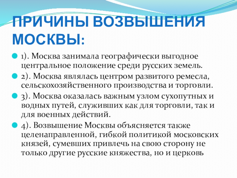 4). Возвышение Москвы объясняется также целенаправленной, гибкой политикой московских князей, сумевших привлечь на свою сторону не только другие русские княжества, но и церковь