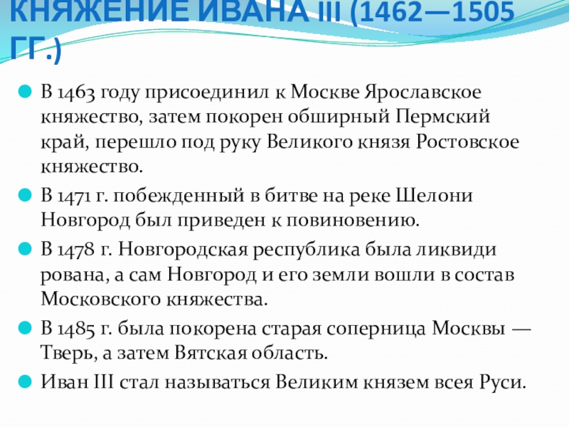 Ярославское княжество, затем покорен обширный Пермский край, перешло под руку Великого князя Ростовское княжество.
