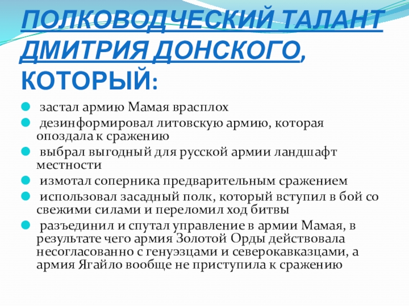 Слайд 9В ходе сражения проявился полководческий талант Дмитрия Донского, который: