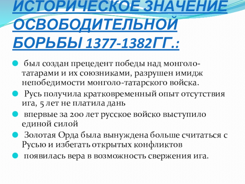 Слайд 10Историческое значение освободительной борьбы 1377-1382гг.:
