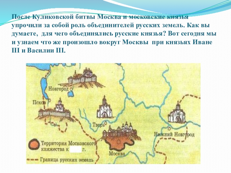 объединителей русских земель. Как вы думаете, для чего объединялись русские князья? Вот сегодня мы и узнаем что же произошло вокруг Москвы при князьях Иване III и Василии III.