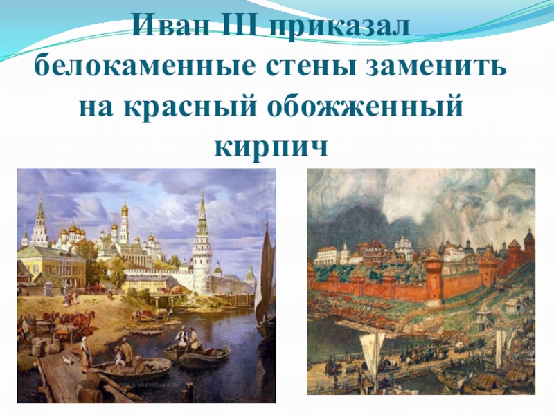 Слайд 15Иван III приказал белокаменные стены заменить на красный обожженный кирпич