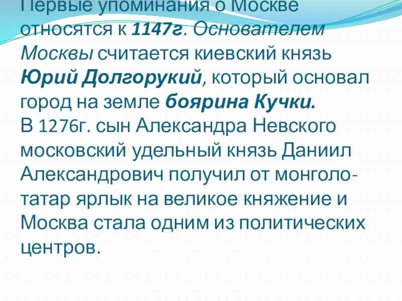 Слайд 4Первые упоминания о Москве относятся к 1147г. Основателем Москвы считается киевский