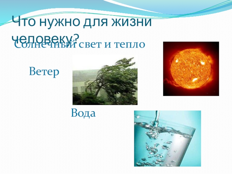 Что нужно для жизни человеку?Солнечный свет и тепло   Ветер
