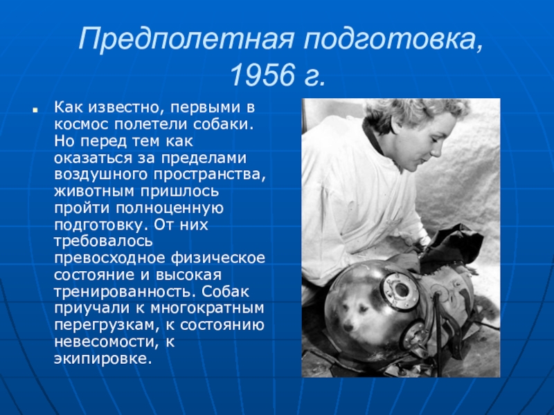 Но перед тем как оказаться за пределами воздушного пространства, животным пришлось пройти полноценную подготовку. От них требовалось превосходное физическое состояние и высокая тренированность. Собак приучали к многократным перегрузкам, к состоянию невесомости, к экипировке.