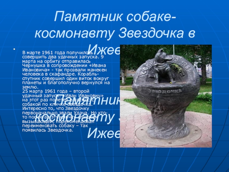 Слайд 9Памятник собаке-космонавту Звездочка в Ижевске Памятник собаке-космонавту Звездочка в Ижевске