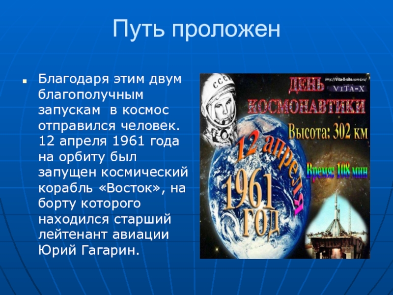 Путь проложенБлагодаря этим двум благополучным запускам в космос отправился человек. 12 апреля 1961 года на орбиту был