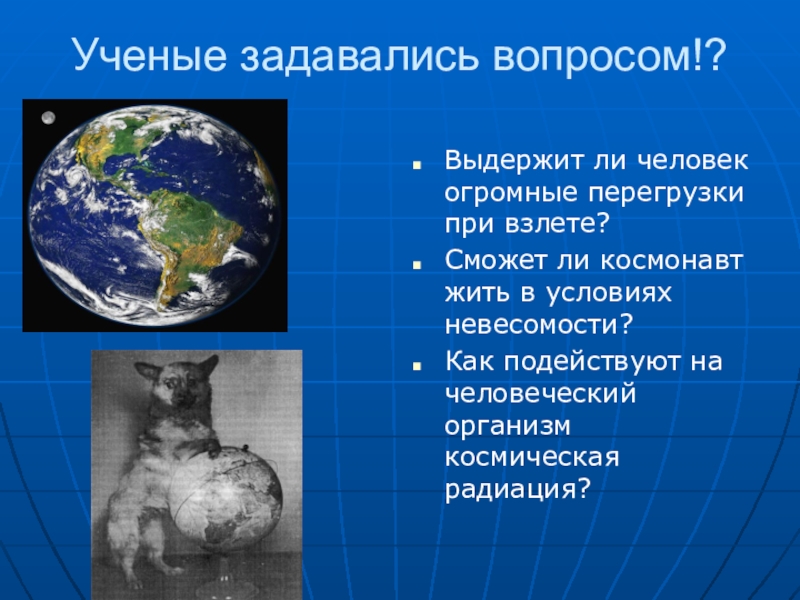 Ученые задавались вопросом!?Выдержит ли человек огромные перегрузки при взлете?Сможет ли космонавт жить в условиях невесомости?Как подействуют на человеческий организм космическая радиация?