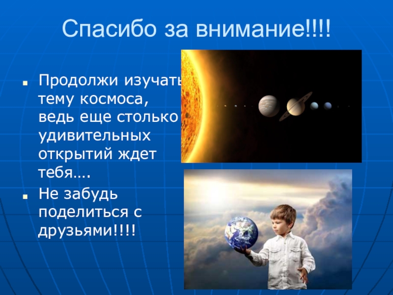 Спасибо за внимание!!!!Продолжи изучать тему космоса, ведь еще столько удивительных открытий ждет тебя….Не забудь поделиться с друзьями!!!!