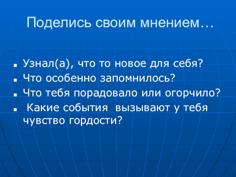 Поделись своим мнением…Узнал(а), что то новое для себя?Что особенно запомнилось?Что тебя порадовало или огорчило? Какие события вызывают