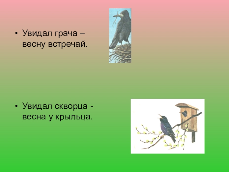 Увидал грача – весну встречай.Увидал скворца - весна у крыльца.