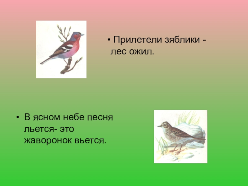 В ясном небе песня льется- это жаворонок вьется. Прилетели зяблики - лес ожил.