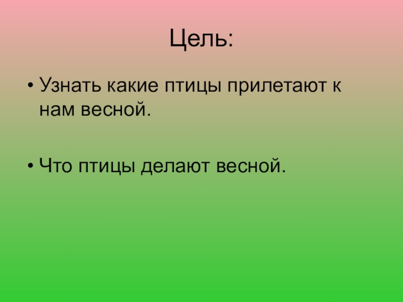 Цель:Узнать какие птицы прилетают к нам весной.Что птицы делают весной.