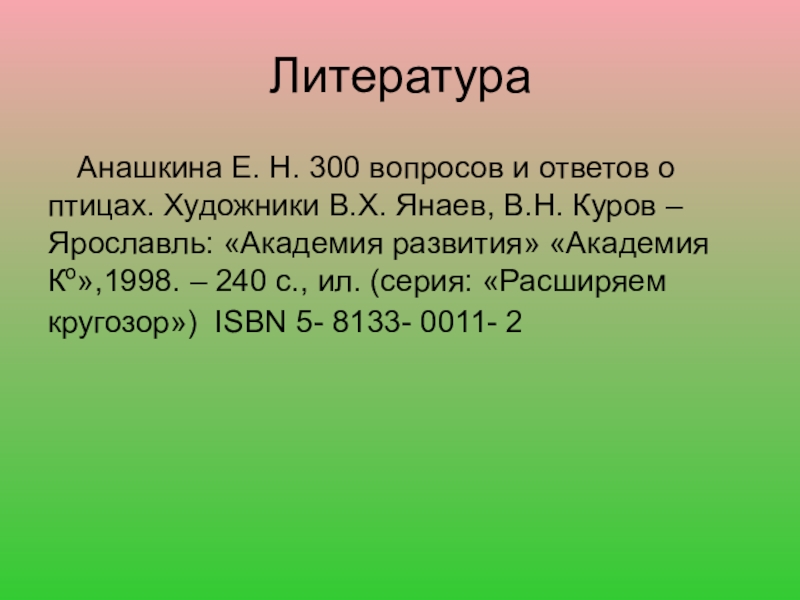 Литература  Анашкина Е. Н. 300 вопросов и ответов о птицах. Художники В.Х. Янаев, В.Н. Куров –