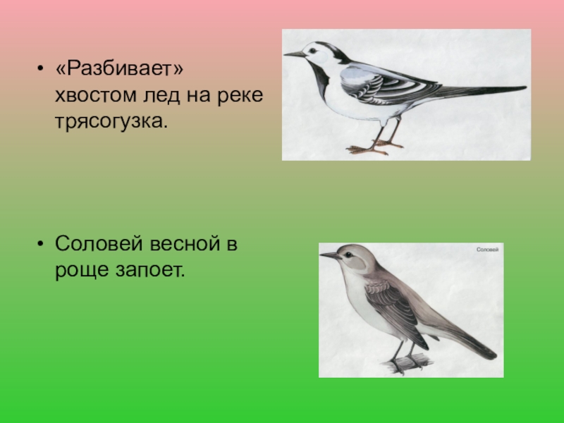 «Разбивает» хвостом лед на реке трясогузка.Соловей весной в роще запоет.