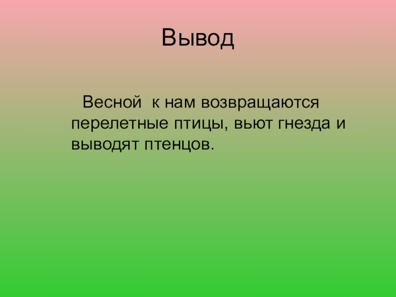ВыводВесной к нам возвращаются перелетные птицы, вьют гнезда и выводят птенцов.