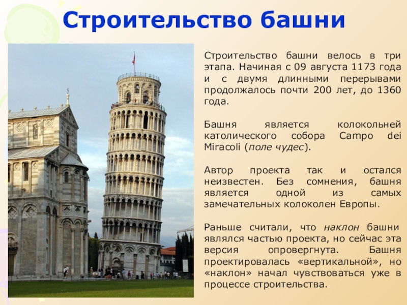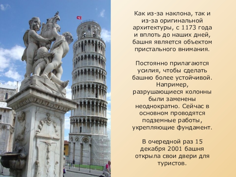 Слайд 46Вскоре, после начала строительства в 1173 году, фундамент Пизанской башни положили