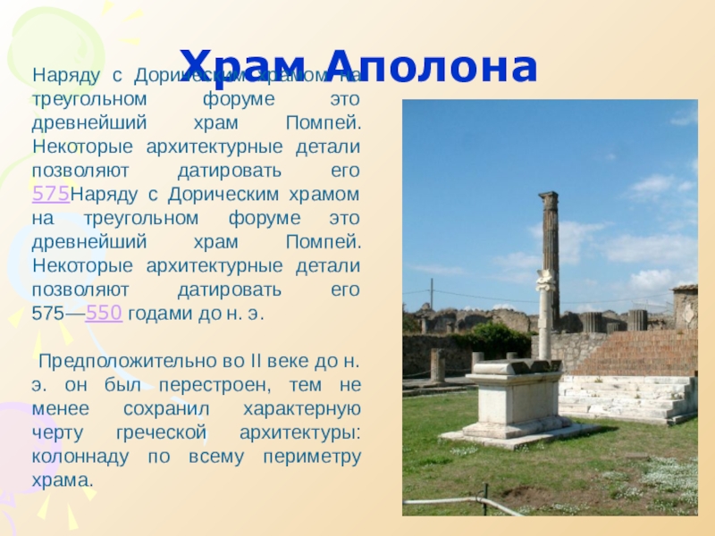 Помпей. Некоторые архитектурные детали позволяют датировать его 575Наряду с Дорическим храмом на треугольном форуме это древнейший храм Помпей. Некоторые архитектурные детали позволяют датировать его 575—550 годами до н. э.