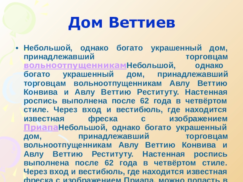 украшенный дом, принадлежавший торговцам вольноотпущенникам Авлу Веттию Конвива и Авлу Веттию Реституту. Настенная роспись выполнена после 62 года в четвёртом стиле. Через вход и вестибюль, где находится известная фреска с изображением ПриапаНебольшой, однако богато украшенный дом, принадлежавший торговцам вольноотпущенникам Авлу Веттию Конвива и Авлу Веттию Реституту. Настенная роспись выполнена после 62 года в четвёртом стиле. Через вход и вестибюль, где находится известная фреска с изображением Приапа, можно попасть в атрий, стены которого украшены фризами с амурамиНебольшой, однако богато украшенный дом, принадлежавший торговцам вольноотпущенникам Авлу Веттию Конвива и Авлу Веттию Реституту. Настенная роспись выполнена после 62 года в четвёртом стиле. Через вход и вестибюль, где находится известная фреска с изображением Приапа, можно попасть в атрий, стены которого украшены фризами с амурами и психеямиНебольшой, однако богато украшенный дом, принадлежавший торговцам вольноотпущенникам Авлу Веттию Конвива и Авлу Веттию Реституту. Настенная роспись выполнена после 62 года в четвёртом стиле. Через вход и вестибюль, где находится известная фреска с изображением Приапа, можно попасть в атрий, стены которого украшены фризами с амурами и психеями. Два крыла атрия украшены медальонами с головой МедузыНебольшой, однако богато украшенный дом, принадлежавший торговцам вольноотпущенникам Авлу Веттию Конвива и Авлу Веттию Реституту. Настенная роспись выполнена после 62 года в четвёртом стиле. Через вход и вестибюль, где находится известная фреска с изображением Приапа, можно попасть в атрий, стены которого украшены фризами с амурами и психеями. Два крыла атрия украшены медальонами с головой Медузы и Силена (справа) и фреской с дерущимися петухами (слева). Ещё один вход ведёт сюда с улицы через хозяйственные постройки.