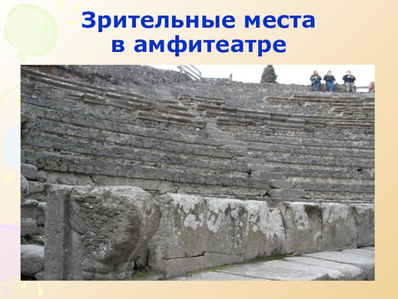 Нижние несколько рядов (ima cavea) предназначались для знатных горожан. Два балкона над боковыми входами — для жриц и организаторов представлений. Сцена была декорирована колоннами, карнизами и статуями, датируемыми временем после 62 года.