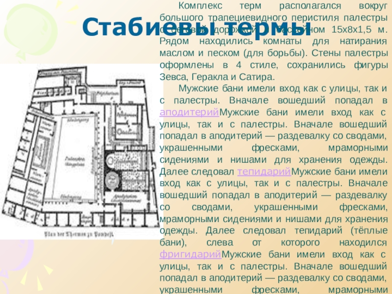 Мужские бани имели вход как с улицы, так и с палестры. Вначале вошедший попадал в аподитерийМужские бани имели вход как с улицы, так и с палестры. Вначале вошедший попадал в аподитерий — раздевалку со сводами, украшенными фресками, мраморными сидениями и нишами для хранения одежды. Далее следовал тепидарийМужские бани имели вход как с улицы, так и с палестры. Вначале вошедший попадал в аподитерий — раздевалку со сводами, украшенными фресками, мраморными сидениями и нишами для хранения одежды. Далее следовал тепидарий (тёплые бани), слева от которого находился фригидарийМужские бани имели вход как с улицы, так и с палестры. Вначале вошедший попадал в аподитерий — раздевалку со сводами, украшенными фресками, мраморными сидениями и нишами для хранения одежды. Далее следовал тепидарий (тёплые бани), слева от которого находился фригидарий — зал с бассейном с холодной водой. За тепидарием был кальдарий с бассейном горячей воды и ёмкостью с холодной.