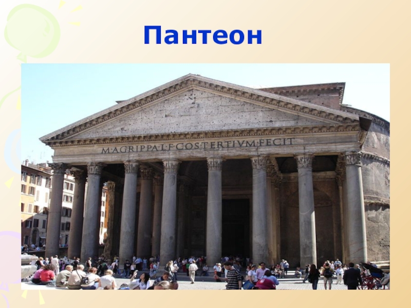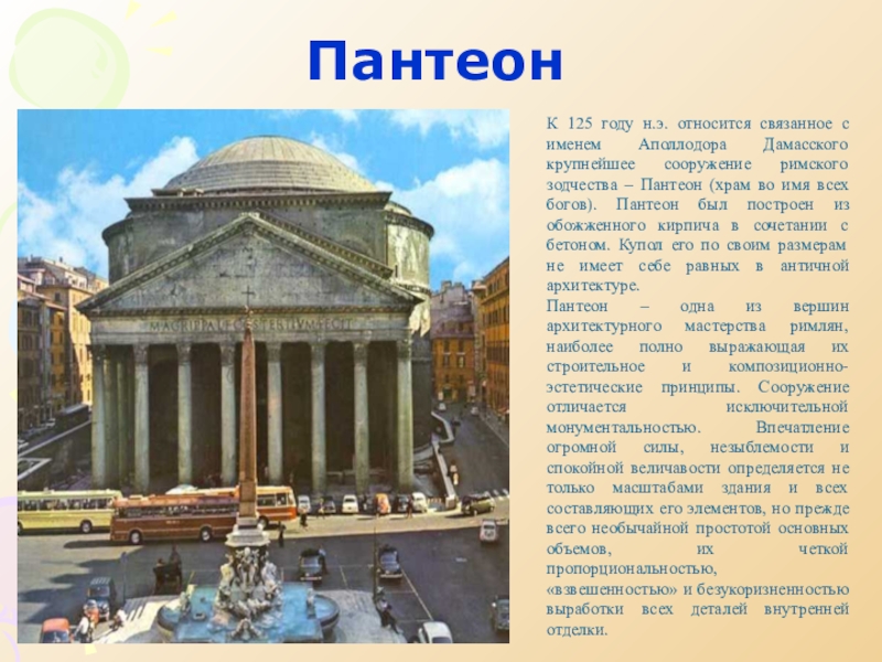 крупнейшее сооружение римского зодчества – Пантеон (храм во имя всех богов). Пантеон был построен из обожженного кирпича в сочетании с бетоном. Купол его по своим размерам не имеет себе равных в античной архитектуре.