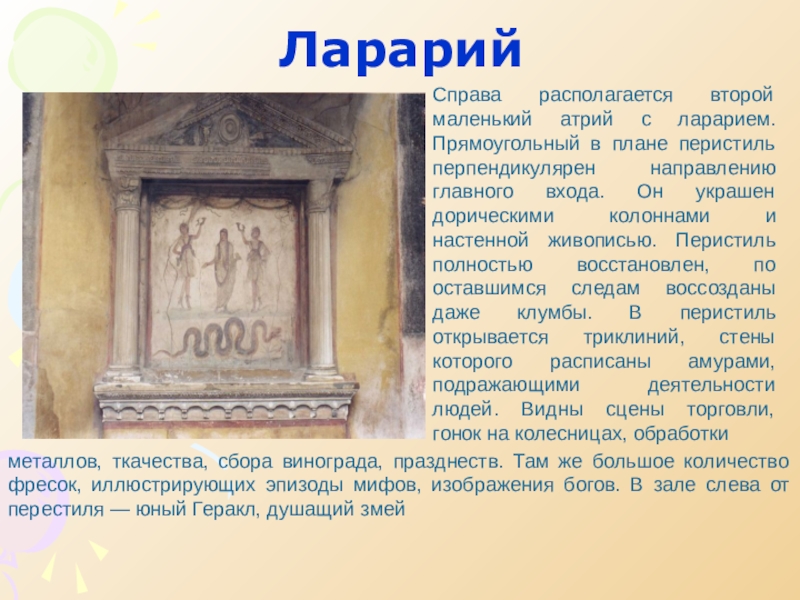 металлов, ткачества, сбора винограда, празднеств. Там же большое количество фресок, иллюстрирующих эпизоды мифов, изображения богов. В зале слева от перестиля — юный Геракл, душащий змей